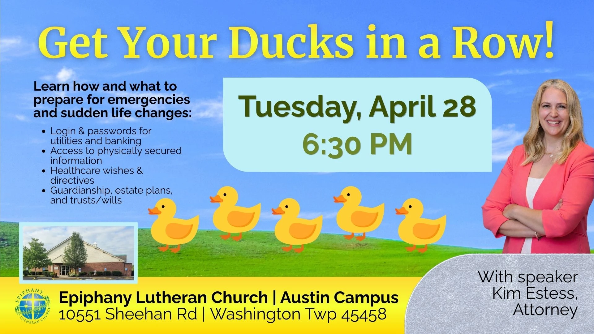 This event will take place on Tuesday, April 28 at 6:30 p.m. at our Austin Campus (10551 Sheehan Rd, Washington Township, OH 45458). Speaker Kim Estess, attorney (O’Diam & Estess Law Group, Inc.) will present on topics including the basics of long-term care planning, wills and trusts, and powers of attorney. Light refreshments will be provided. Limited childcare spots are available (age 11 and under; PRE-REGISTRATION IS REQUIRED). Register by Tuesday, April 21 through the online form. Questions? Email coordinator Lisa Dietrich at ljdietrich10@gmail.com.